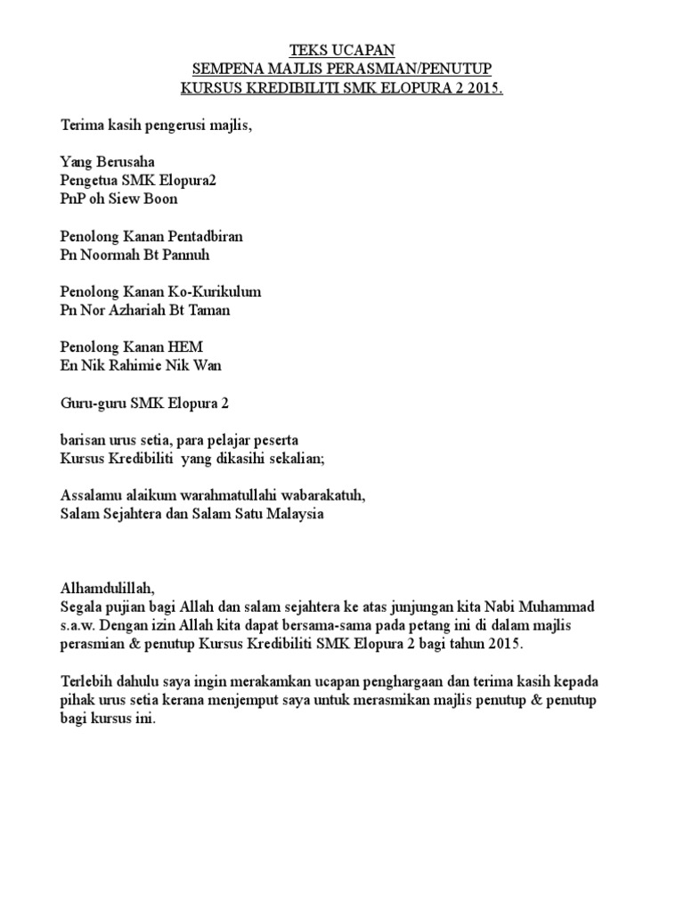 . Alhamdulillah mari kita memanjatkan setinggi-tinggi kesyukuran ke hadrat llahi kerana dengan limpah kurnia dan izin-Nya jua kita dapat berkumpul di Dataran Hasimah pada pagi yang indah ini bagi meraikan Majlis Restu Ilmu SPM 2015. So mungkin ramai yang sudah lupa menyusun ayat untuk dijadikan teks ucapan alu-aluan. Pukul 630pm baru nak google cari contoh teks ucapan.